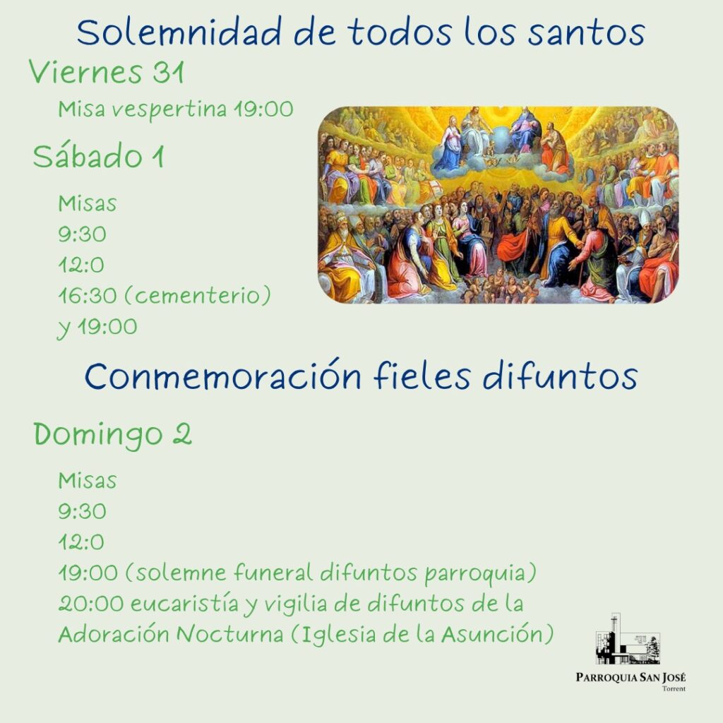 Os invitamos a participar en las celebraciones litúrgicas de estos días, en los que la Iglesia honra a todos los santos y ora por nuestros difuntos. 📅 Solemnidad de Todos los Santos ➡️ Viernes 31 de octubre – Misa vespertina: 19:00 h ➡️ Sábado 1 de noviembre – Misas: 9:30 h, 12:00 h, 16:30 h…
